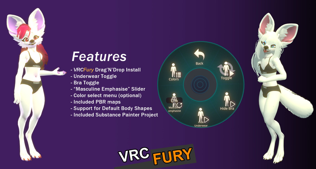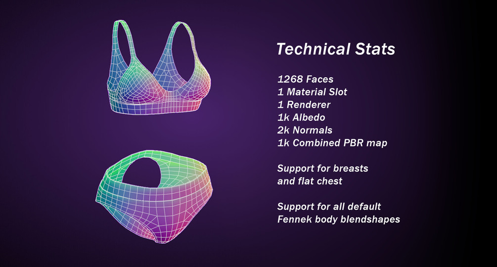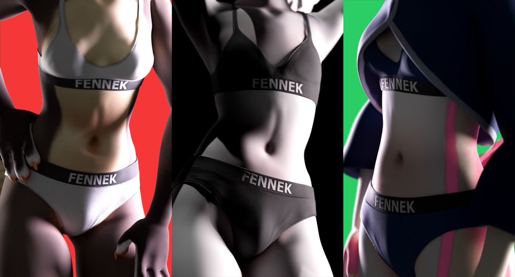 Adorn your Fennek with this adorable set of comfortable underwear, this asset has been created with the sole purpose of making your avatar look excellent in this realistically constructed set of Underwear and Bra. the fabric and seaming/ stitching of the clothes make them very physically accurate to actual real life clothing. special attention has been put into the texturing and normal generation of this asset, the included materials provide you with an accurate representation of fabric underwear including hand painted folds and stitching
